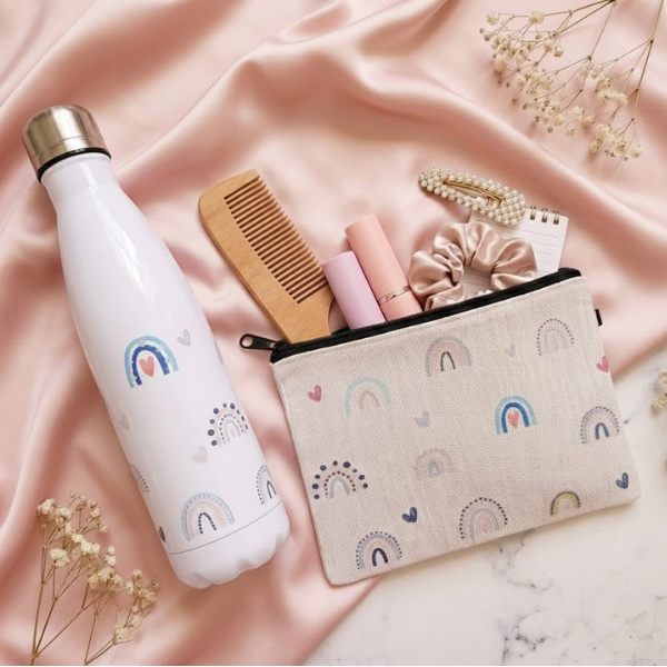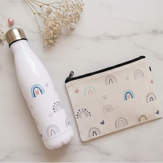מארז מיוחד הכולל נרתיק בד מעוצב מבד פשתן בסגנון עדין וצבעוני, לצד בקבוק תרמי אישי בעיצוב תואם של קשתות.
